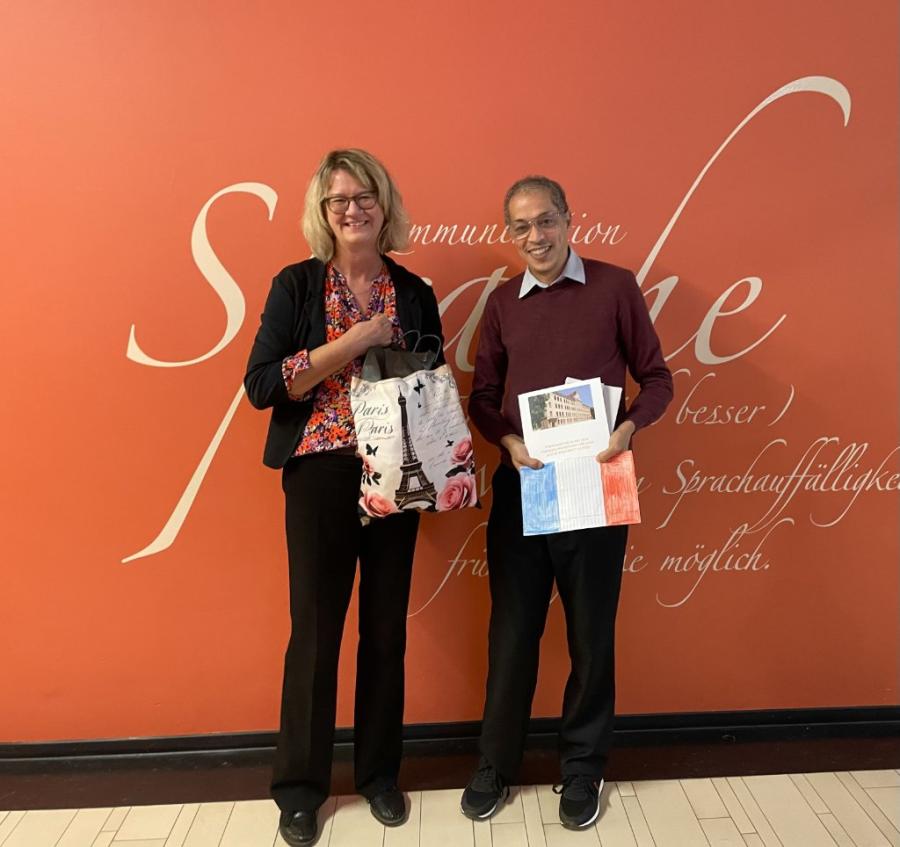 Ein erstes Highlight im Rahmen von Erasmus war der Besuch von Gästen aus Frankreich am 23. und 24. Oktober 2025. Der Schulleiter des Collège Dorval Orly, Herr Boujaddi, besuchte zusammen mit zwei Lehrkräften seiner Schule, der Schulsachbearbeiterin sowie einem Schüler unser Förderzentrum. Dort erwartete die Gäste ein vielfältiges Programm: eine Führung durch unsere Schule, Hospitationen in verschiedenen Klassen sowie Gesprächsrunden zum Austausch über den Aufbau unserer Schule, unsere spezielle didaktische und methodische Vorgehensweise, den Ablauf unserer Diagnostik sowie die Organisation der inklusiven Förderung. Auch wurden den Gästen verschiedene sprachheilpädagogische Fördermaterialien sowie die Arbeit mit unserem Schulhund Selma vorgestellt. Schön war auch ein gemeinsames Abendessen von Lehrkräften unserer Schule und den Gästen aus Paris im Restaurant Alex, an dem es zu einem lebendigen Austausch kam. Unsere Gäste reisten mit vielen Eindrücken und Ideen ab und luden uns zu einem Gegenbesuch ein. Diese Einladung nehmen wir gerne an!