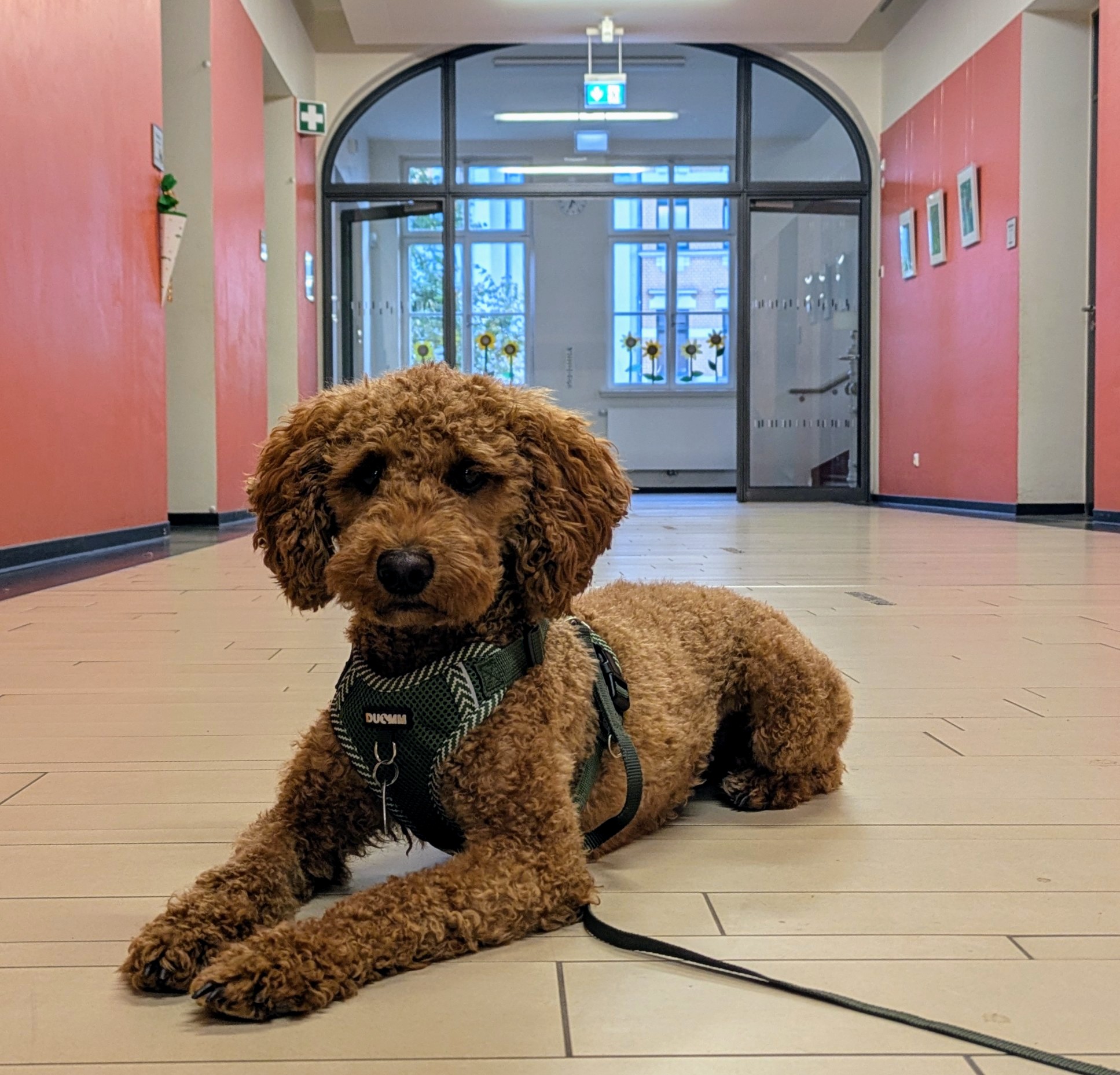 Unsere Schule hat Besuch auf vier Pfoten: Selma, eine junge Pudelhündin, hilft in einer 1. Klasse mit. Sie gehört zu Frau Müller, einer Lehrerin an unserer Schule.